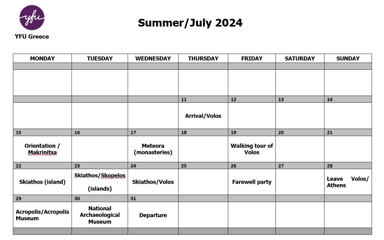 Geziler ve aktiviteler: Skiathos adasında 2 gece konaklama ve yakındaki Skopelos adasına günü birlik gezi, bir günlük tarihi dağ köyü gezisi, bir günlük Meteora gezisi, Doğa Tarihi Müzesi, Volos gezisi, Arkeoloji Müzesi, Atina’da 2 gün konaklama, Acropolis, Yeni Acropolis Müzesi ve Ulusal Arkeoloji Müzesi gezisi
